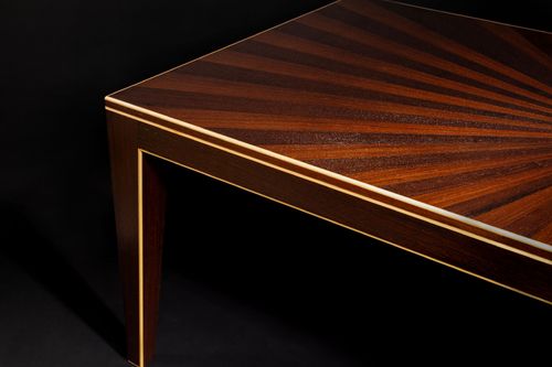The sunburst coffee table seats eight people comfortably, and at the heart of this piece is an intricately inlaid globe. Further features include an inlaid trim made from fumed eucalyptus and lime, which flows from the table top down the tapering legs. Another special feature about this table is that it was designed to be easily assembled and disassembled.